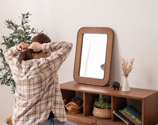本棚やチェストなどの上に立てかけてもお使いいただけます。大きめなつくりなので、上半身全体を見ることが可能。全体のバランスを見ながらヘアセットやメイクをするのにも便利です。