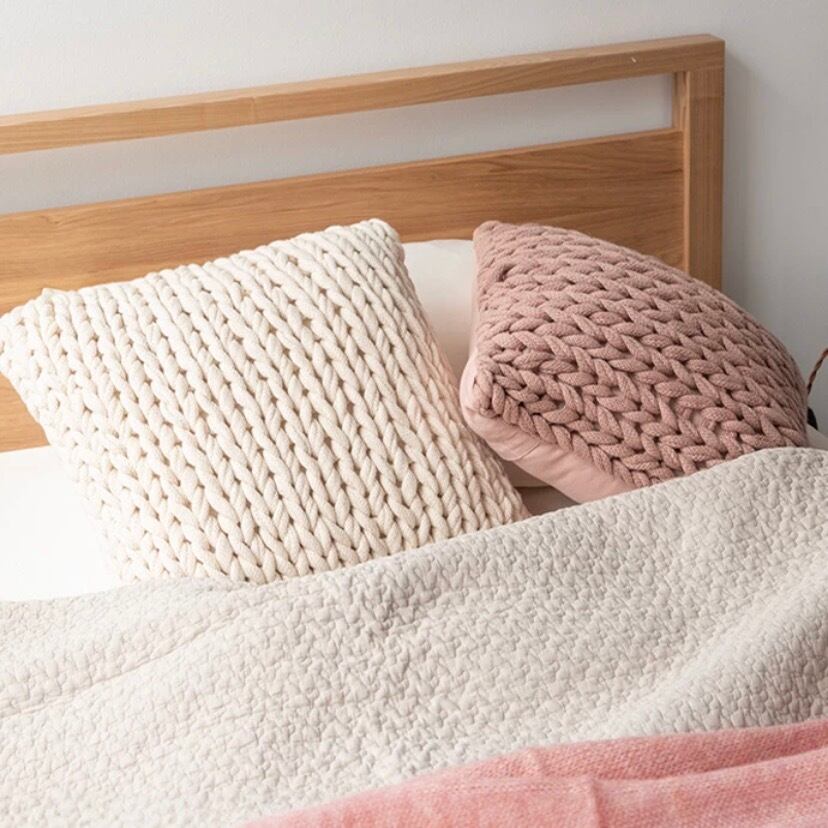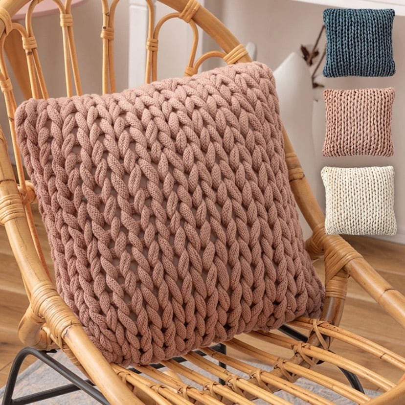 ニットのように丁寧に編み込まれたカバーリングが印象的なクッション。