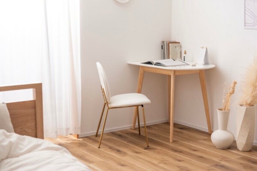 ベロア調の生地×アンティークゴールド脚の組合せが、ガーリーでトレンド感のある雰囲気を演出。