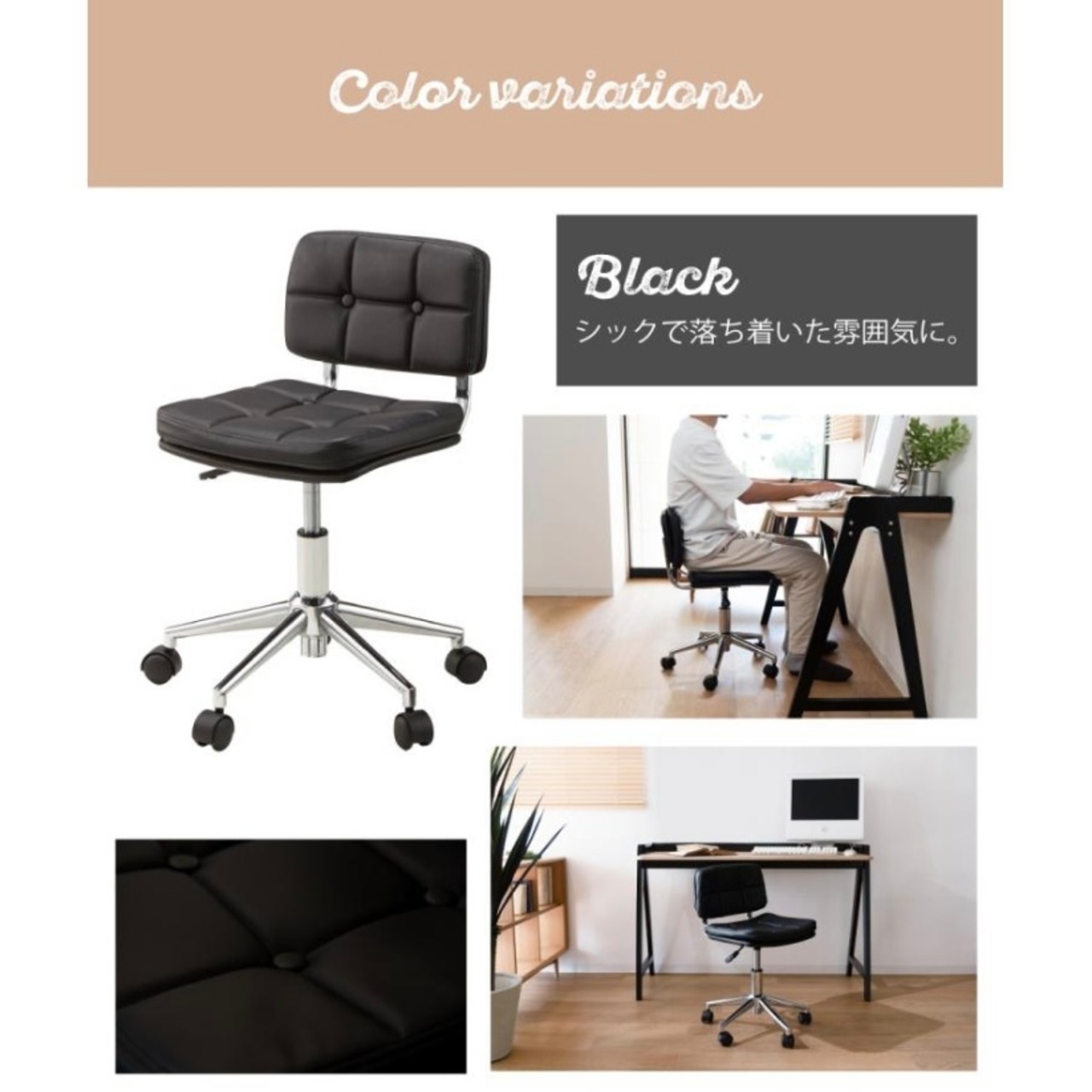 ガス圧の昇降機能が付いているので、一般的なデスクチェアと同じくお使いいただけます。