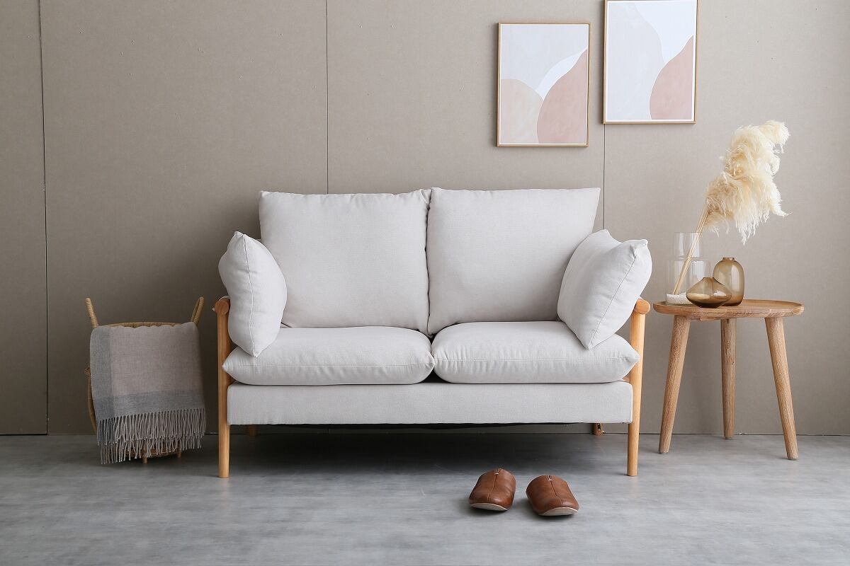 天然木が生み出す上質感とボリュームのあるクッションが特徴の『Harry(ハリー)』2人掛けファブリックソファ