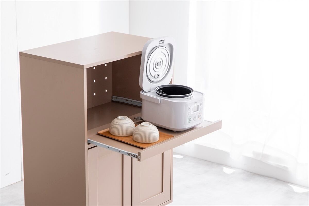 コンパクトなのに収納力抜群。オープン棚、スライド棚、可動棚付き扉の3タイプの収納で家電や食料などもまとめて収納でき、お部屋をすっきり見せることができます。
