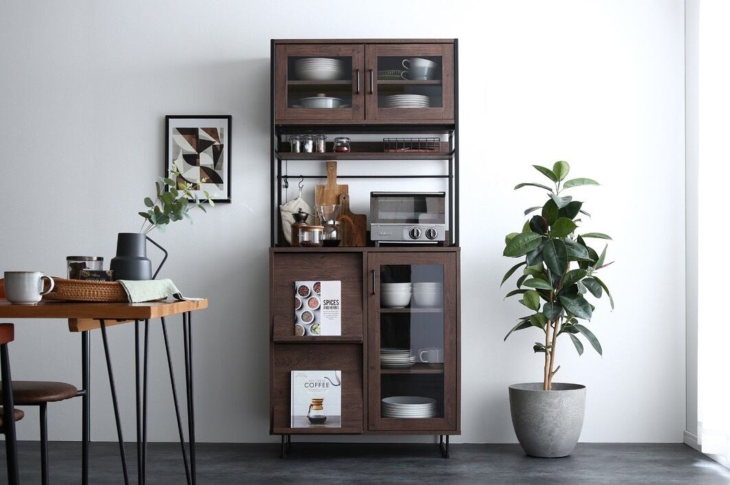 1台で食器や調理家電をまとめて収納できるガラス扉・フラップ扉付き食器棚