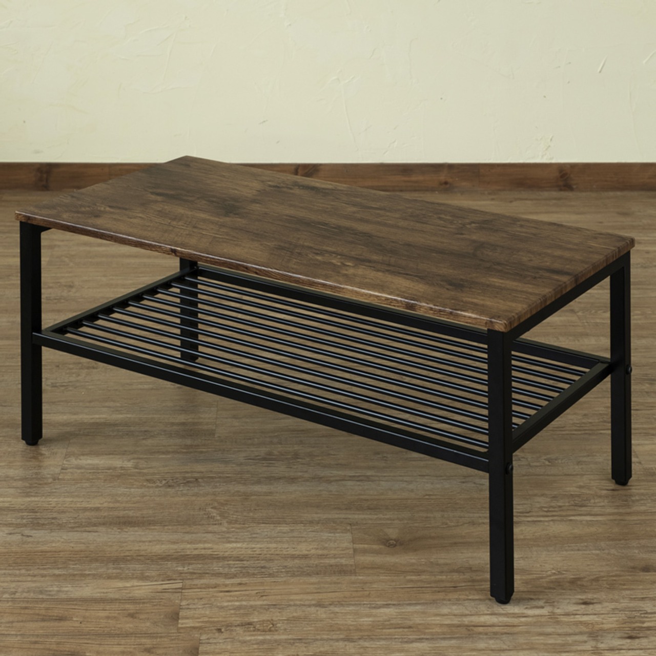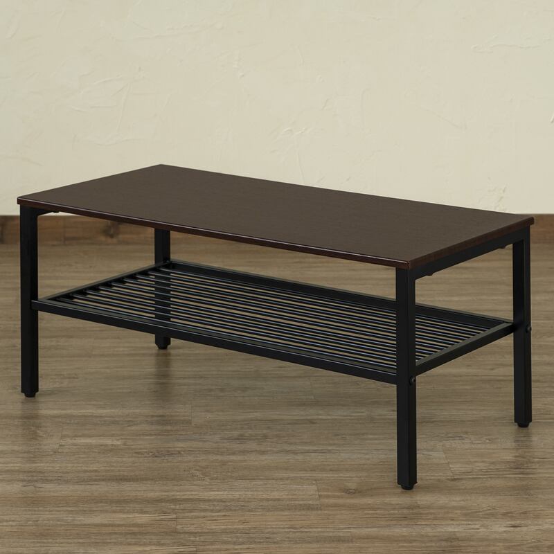 天板は木目調で下部にはごちゃつきがちな雑誌やリモコンなどを収納できるスチール製の棚が付いてます。