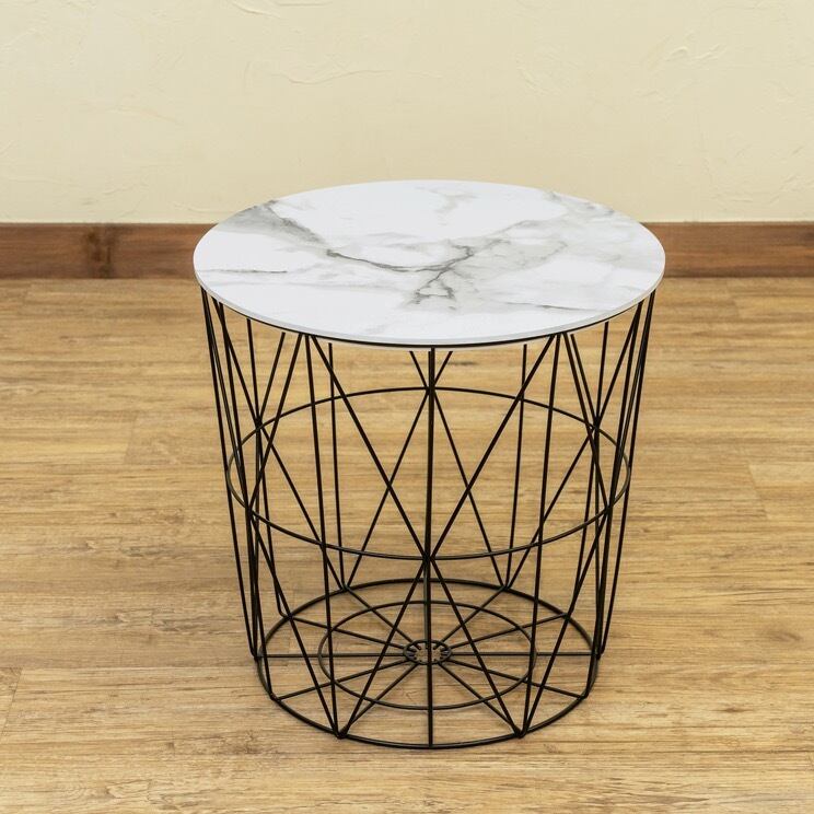 天板下は収納出来るスチール製のバスケットテーブルです。天板裏には溝が有り丸型のバスケットにピッタリはまるようになっています。見せる収納として敢えてオシャレな雑誌等を入れてお部屋のインテリアにも。