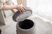 座面は両面で使えるリバーシブル仕様。表面は美しいニュアンスカラーのベロア生地仕上げで、裏面はリアルな大理石柄の天板を施しました。シーンに合わせて、スツールとしてもサイドテーブルとしても幅広くお使いいただけます。座面を開けると中には収納付き。生活感が出がちな小物や雑貨をまとめて収納することが可能です。