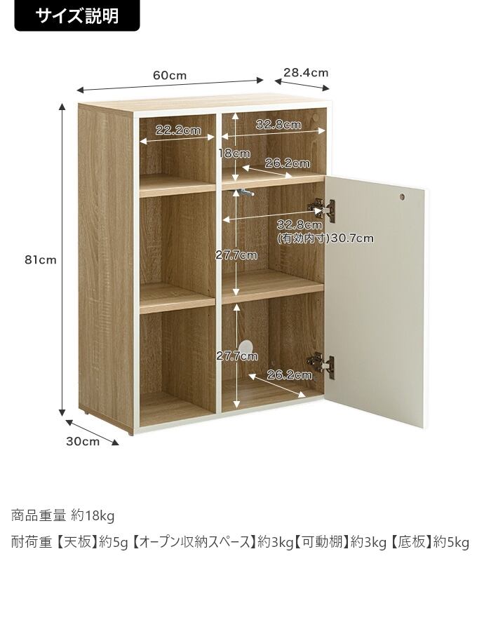 【耐荷重】天板:約5kg 、オープン収納スペース:約3kg、可動棚:約3kg 、底板:約5kg