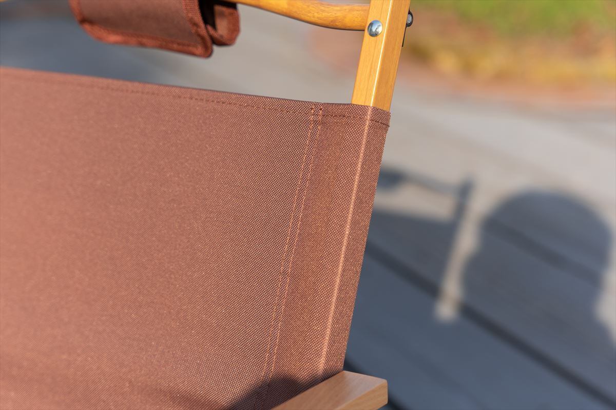 軽量・耐久性抜群のアルミフレームには木目調の塗装を施し、無機質感を感じさせません。直接手が触れる部分のアームレストには天然木を使用し、木の質感と経年変化をお楽しみいただけます。さらに、背面には雑誌や小物を収納するのに便利なポケット付き。座らない時はスリムに折りたたみでき、専用の収納袋付きで持ち運びもラクラクです。