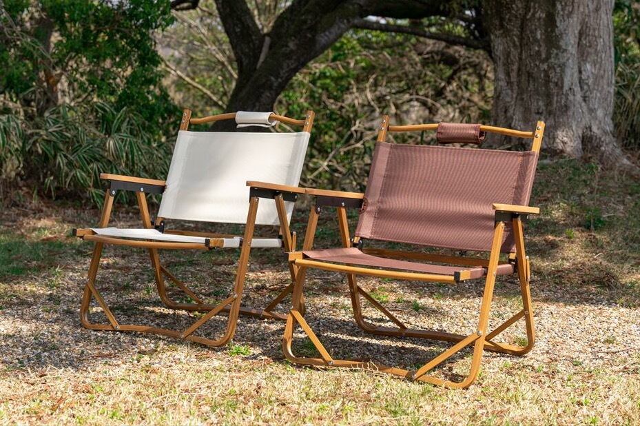 木目調のアルミフレームと天然木のアームレストがナチュラルな雰囲気を演出する、折りたたみアウトドアチェア